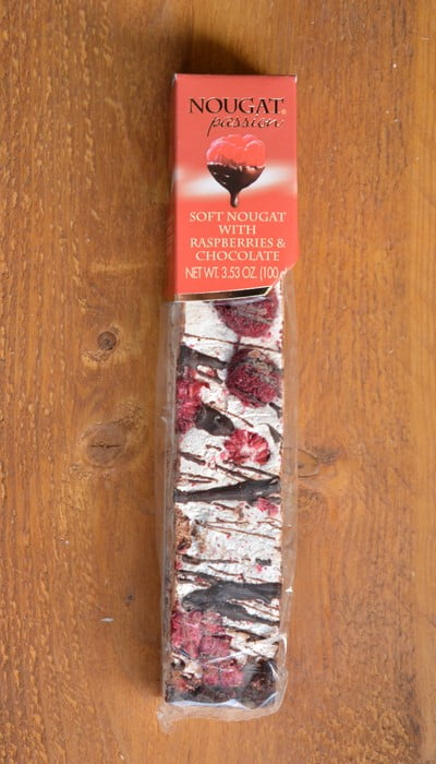 Reep zachte nougat met honing, amandel, hazelnoot, frambozen crème, framboos en pure chocolade