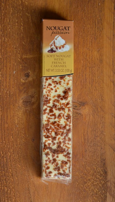 Reep zachte nougat met honing, amandel, hazelnoot, en met Franse caramel crème
