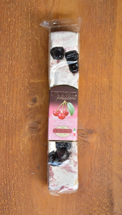 Reep zachte nougat met honing, amandel, hazelnoot, crème van zure kersen en een topping van zure kersen